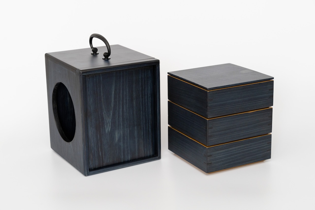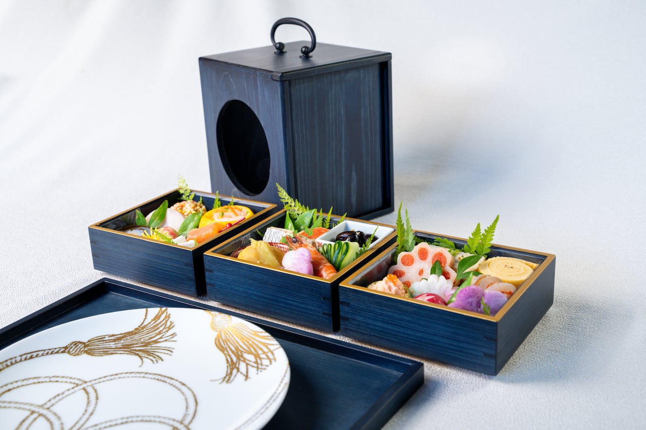 藍:徳島の伝統の色、藍の遊山箱は、深い藍の色合いが新年の食卓を格調高く演出。藍の美しさと遊山箱の細部までこだわった職人技が融合。