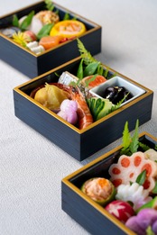 遊山箱をおせちに使うことで、新年の食卓が特別な空間に変わります。工芸品のような美しさを持つ遊山箱は、テーブルに置くだけで華やかさを演出。段ごとに料理を詰める構造で、品目ごとにメリハリがあり、見た目も楽しめます。藍染や木目のデザインが和モダンな雰囲気を醸し出し、伝統とモダンの融合を感じられるのも魅力。敷物や箸置きを添えるだけで簡単に特別なテーブルコーディネートが完成し、お正月らしい華やかな演出が可能です。遊山箱を使ったおせちは、食卓を彩る特別なアイテムとしておすすめです。